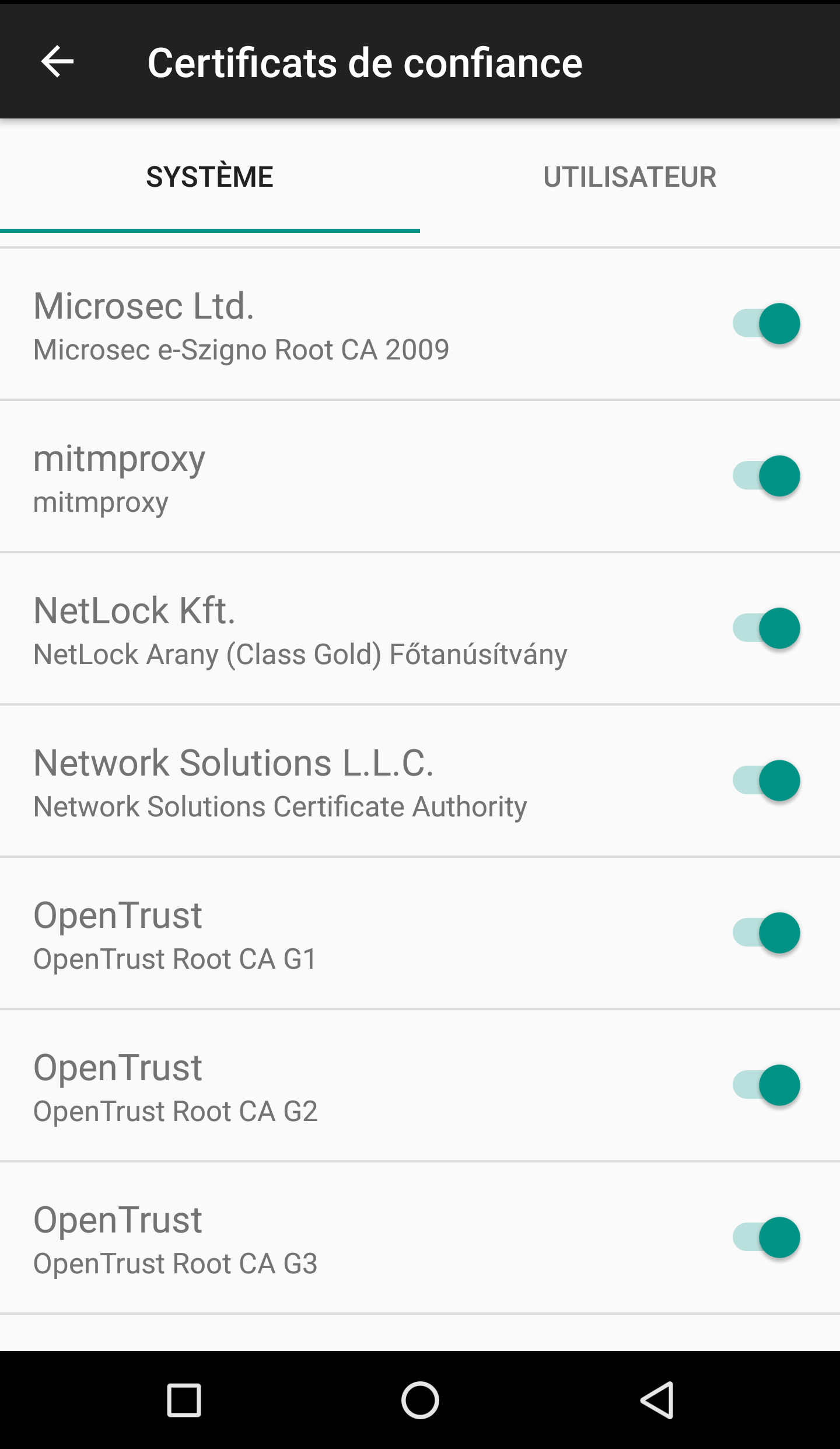 On voit ici le certificat de mitmproxy dans le magasin de certificats Android